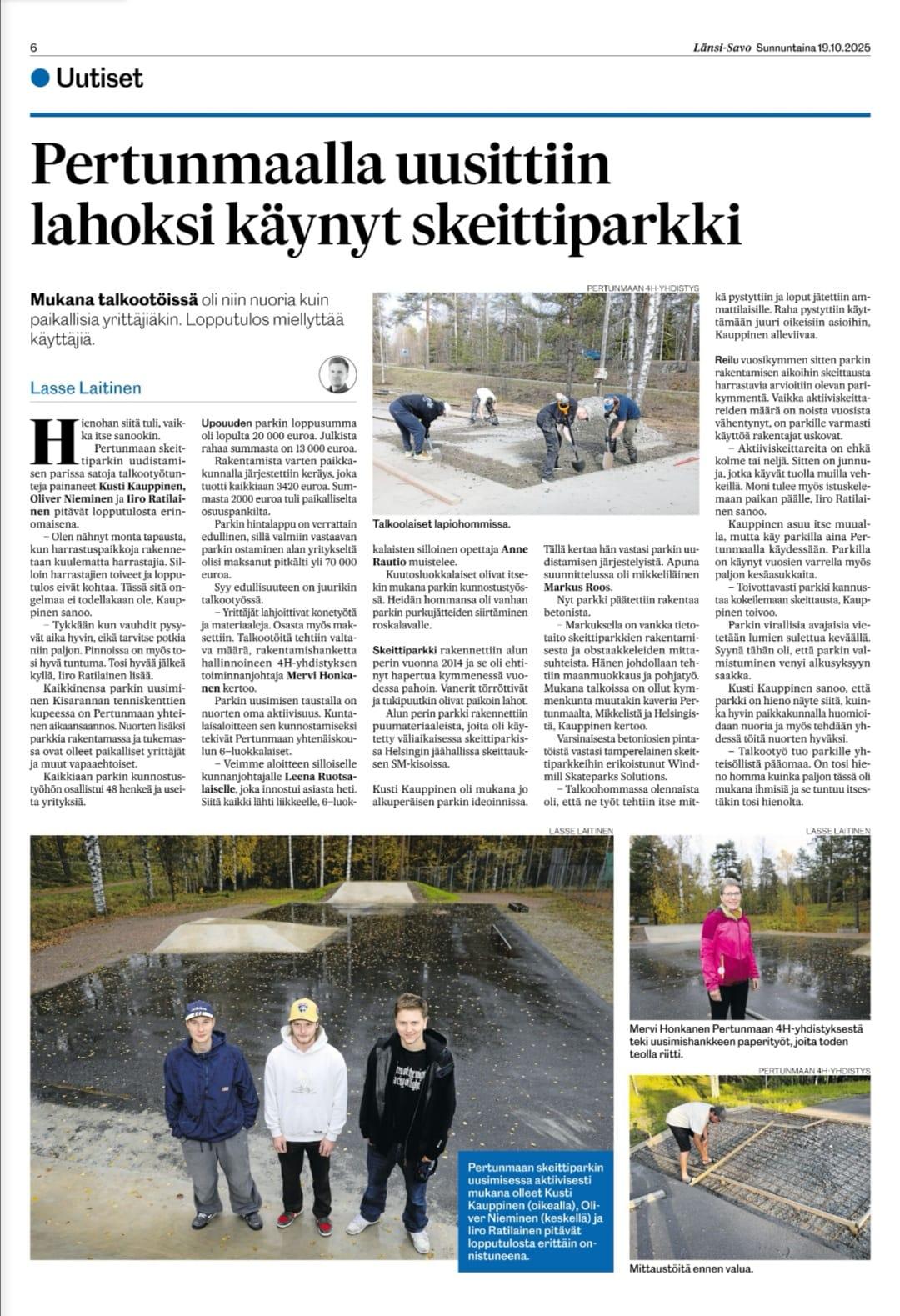 Skeittiparkin uudistamishanke oli pitkään sähköpostiviestejä ja puheluita, konsultointia ja laskelmointia, joita jumpattiin suuntaan ja toiseen loppuvuodesta 2024 pitkälle kevääseen asti. Ensimmäiset käytännön toimet skeittiparkin uudistamiseksi alkoivat huhtikuun 2025 alkupuolella, jolloin vanhat puiset obstaakkelit purettiin pois. Talkoolaisia auttoi kokonainen 6-luokka Pertunmaan yhtenäiskoululta, joka siirsi erittäin tehokkaasti purkujätteet roskalavalle. Nyt asfalttialue oli tyhjä, ja lumien sulamista odoteltiin kärsimättömästi, jotta päästäisiin rakentamaan uutta vanhan tilalle.